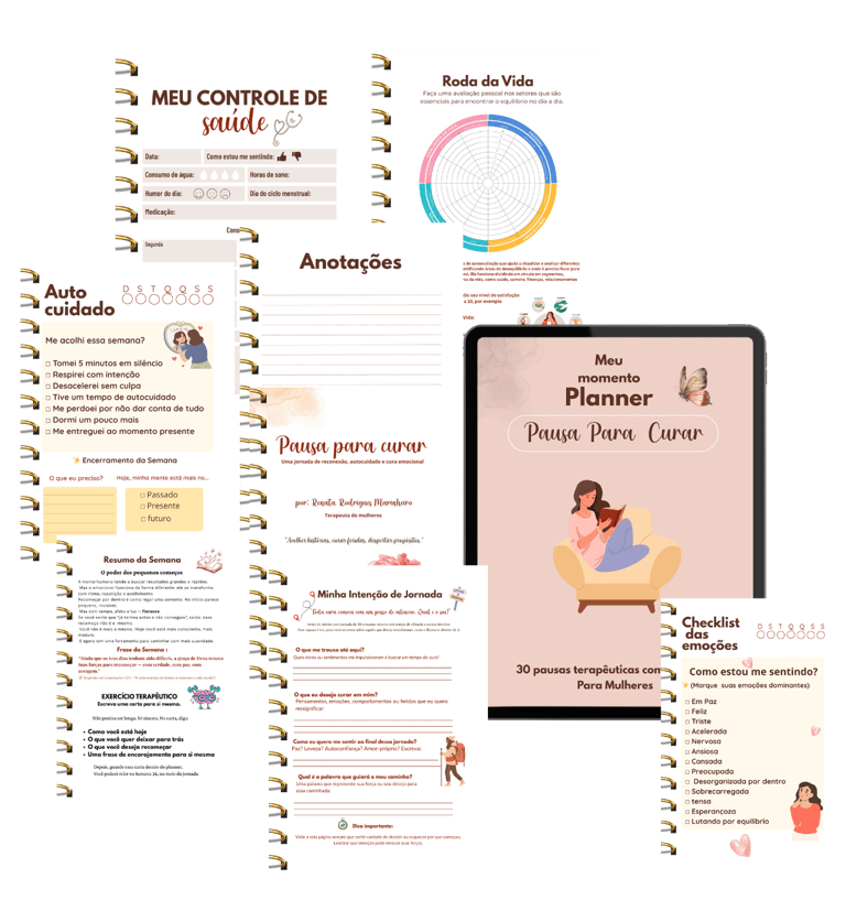 Ele contém 255 páginas exclusivas, com reflexões, exercícios terapêuticos, espaço para anotações e ferramentas práticas.